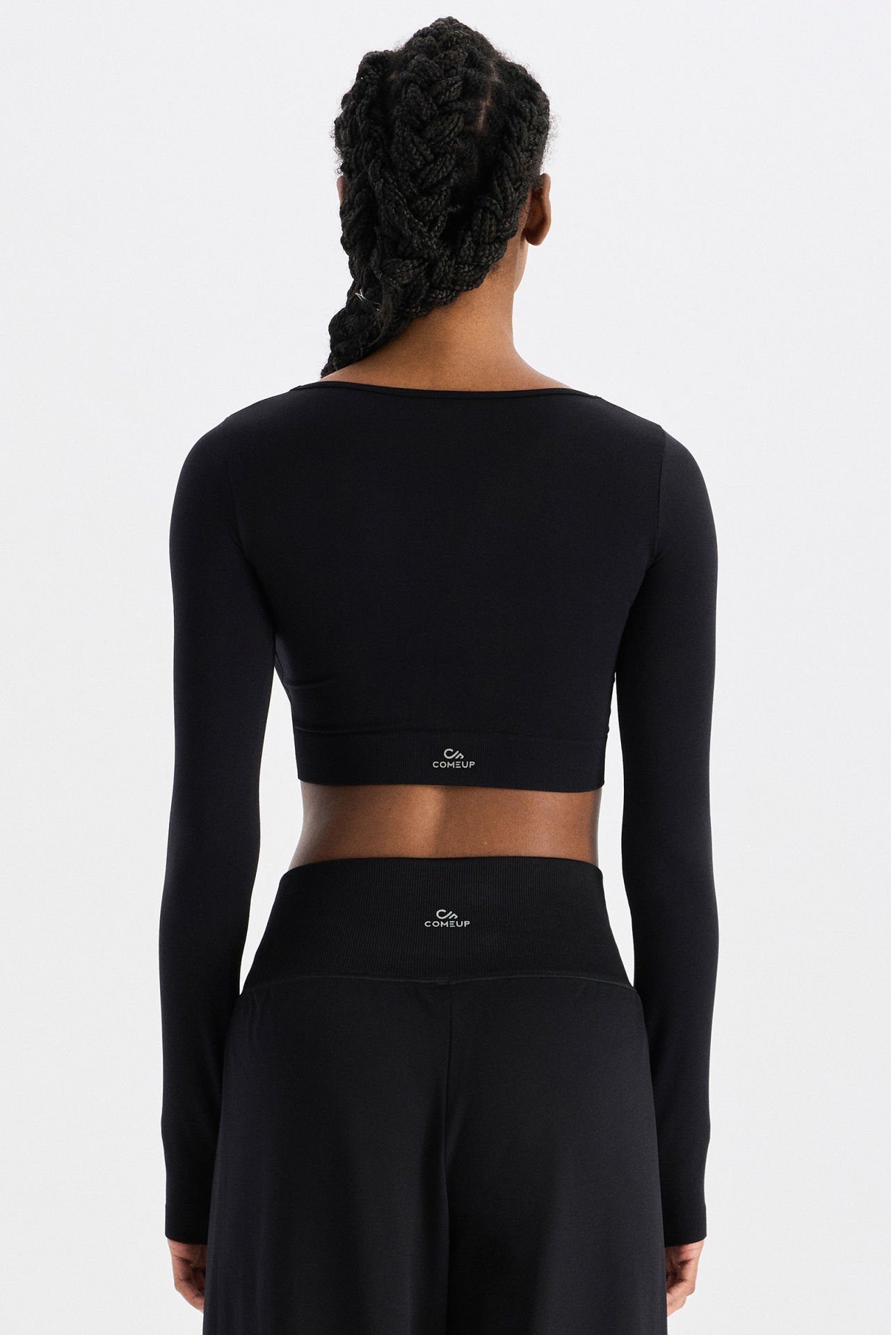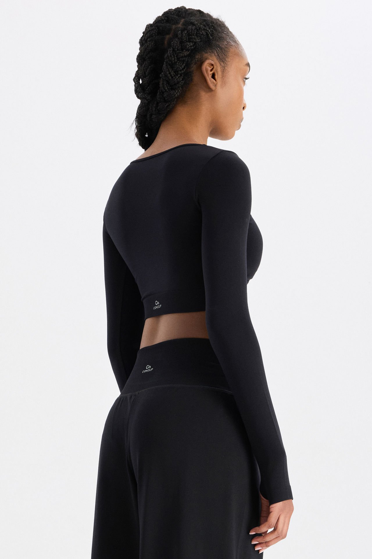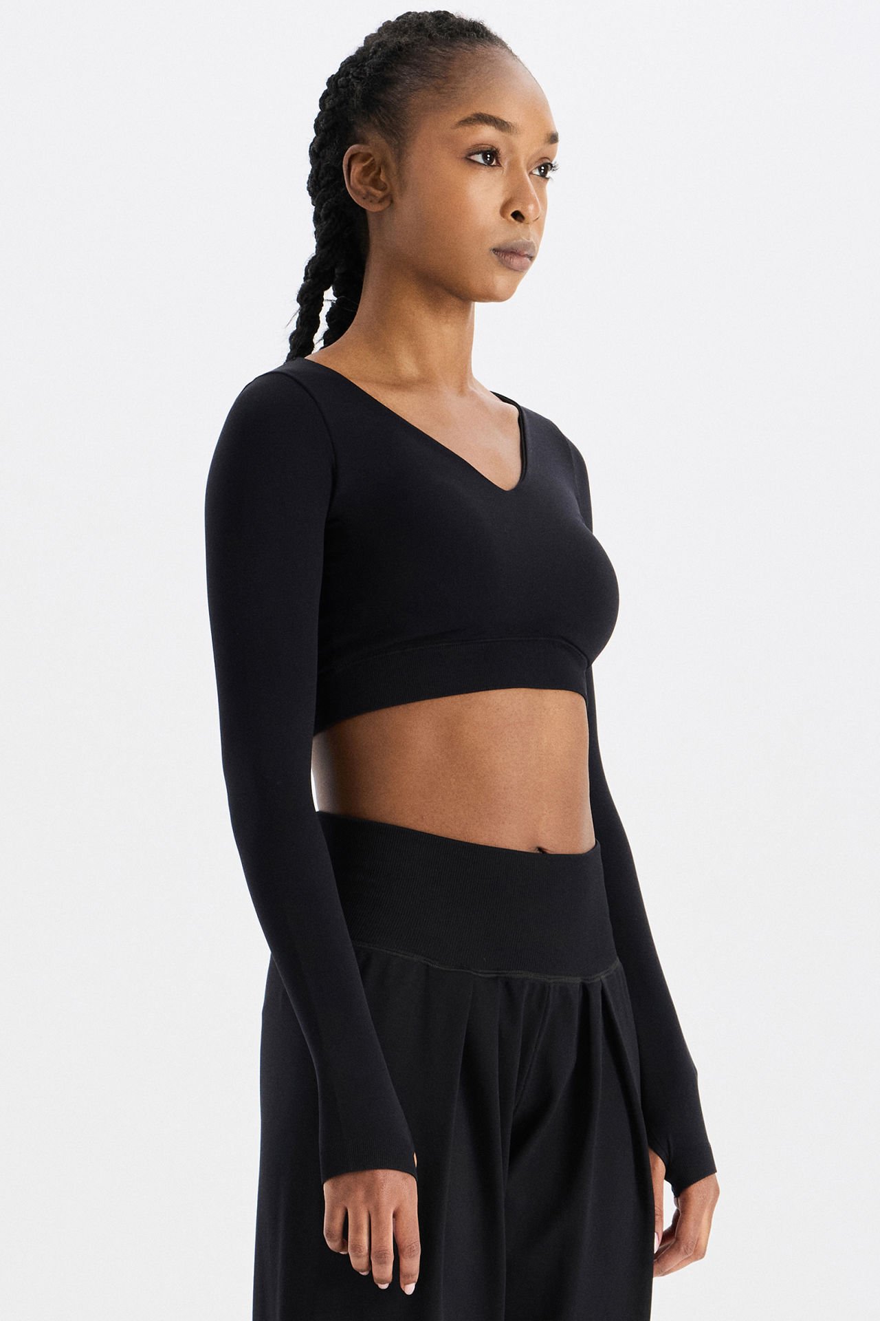 -Crop üst, v yaka formunda ve parmak geçme detaylı.