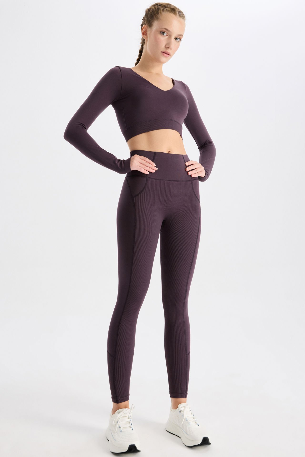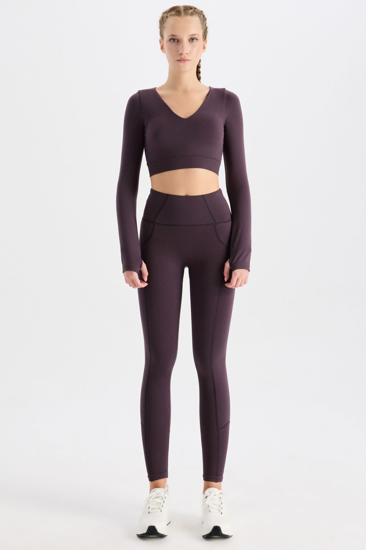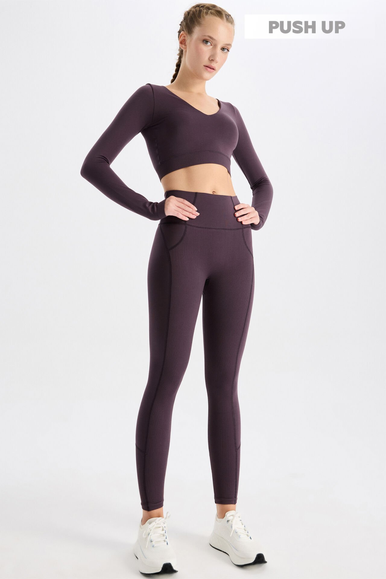 Dikişsiz giyim teknolojisi ile tasarlanan push up tayt, ön kısımda ve paçada bulunan fitilli detaylar, arka ve yanlardaki düz kumaşın modern dikişleriyle birleşerek şık bir görünüm sunar.