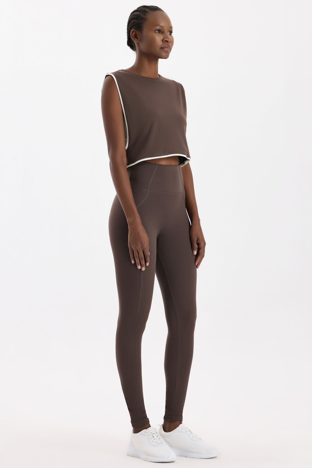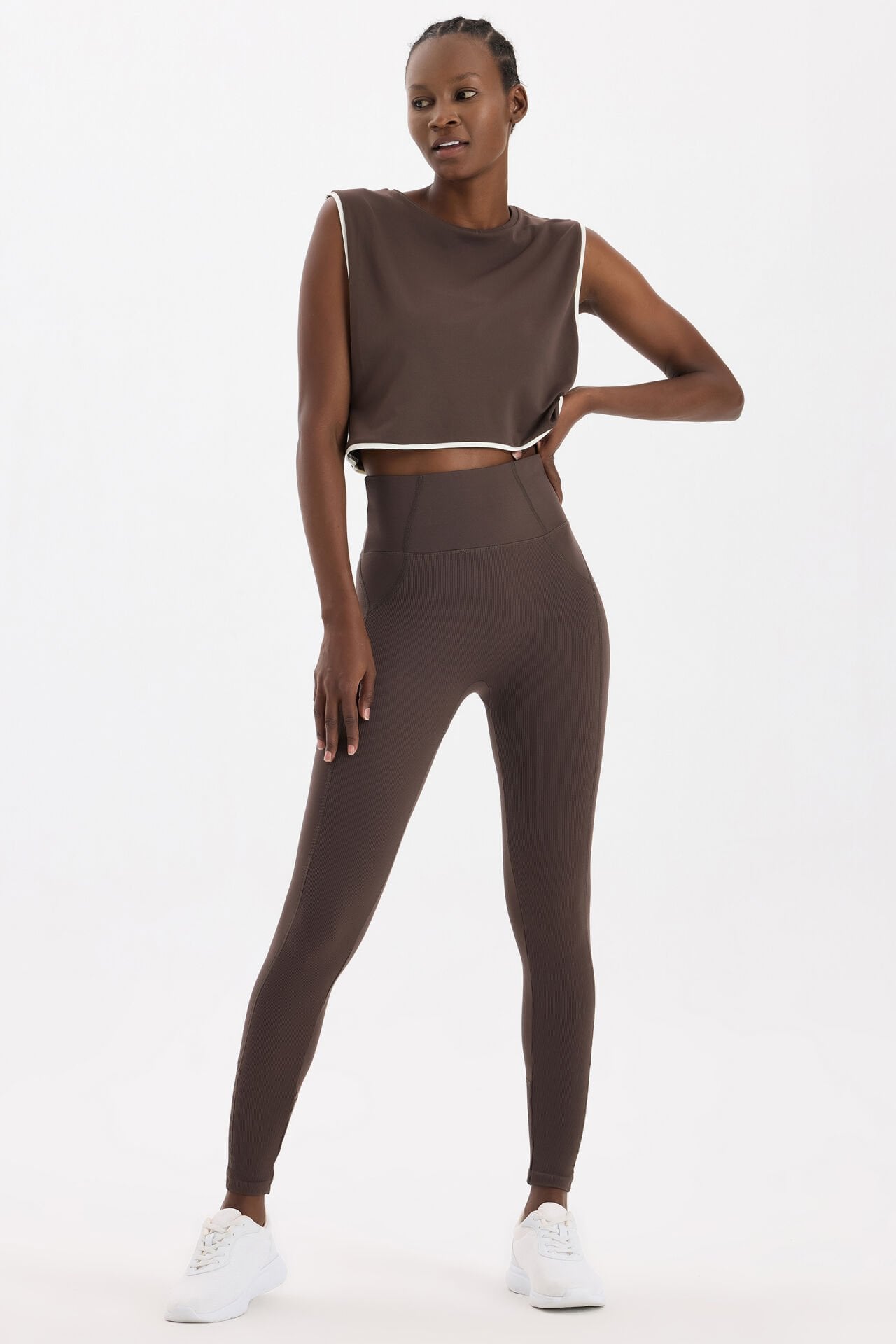 37931 Yüksek Bel Dikiş Detaylı Push Up Tayt Kakao Dansı, modern çizgisiyle şıklığı ve performansı bir araya getirir. Yüksek bel formu, bel çevresine destek sağlayarak vücudu şekillendirir ve zarif bir duruş kazandırır.