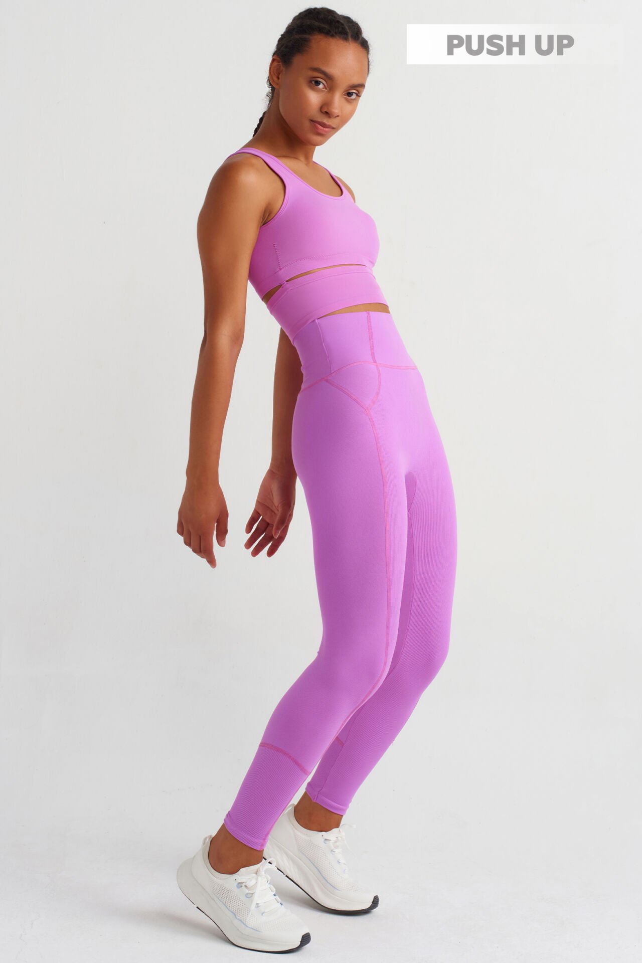 İnce detaylara ve romantik renk tonuna sahip Push up tayt; yüksek bel tasarımı ile beli sarar ve vücut hatlarını vurgular, push up özelliği ile bedende kusursuz bir silüet yaratır.