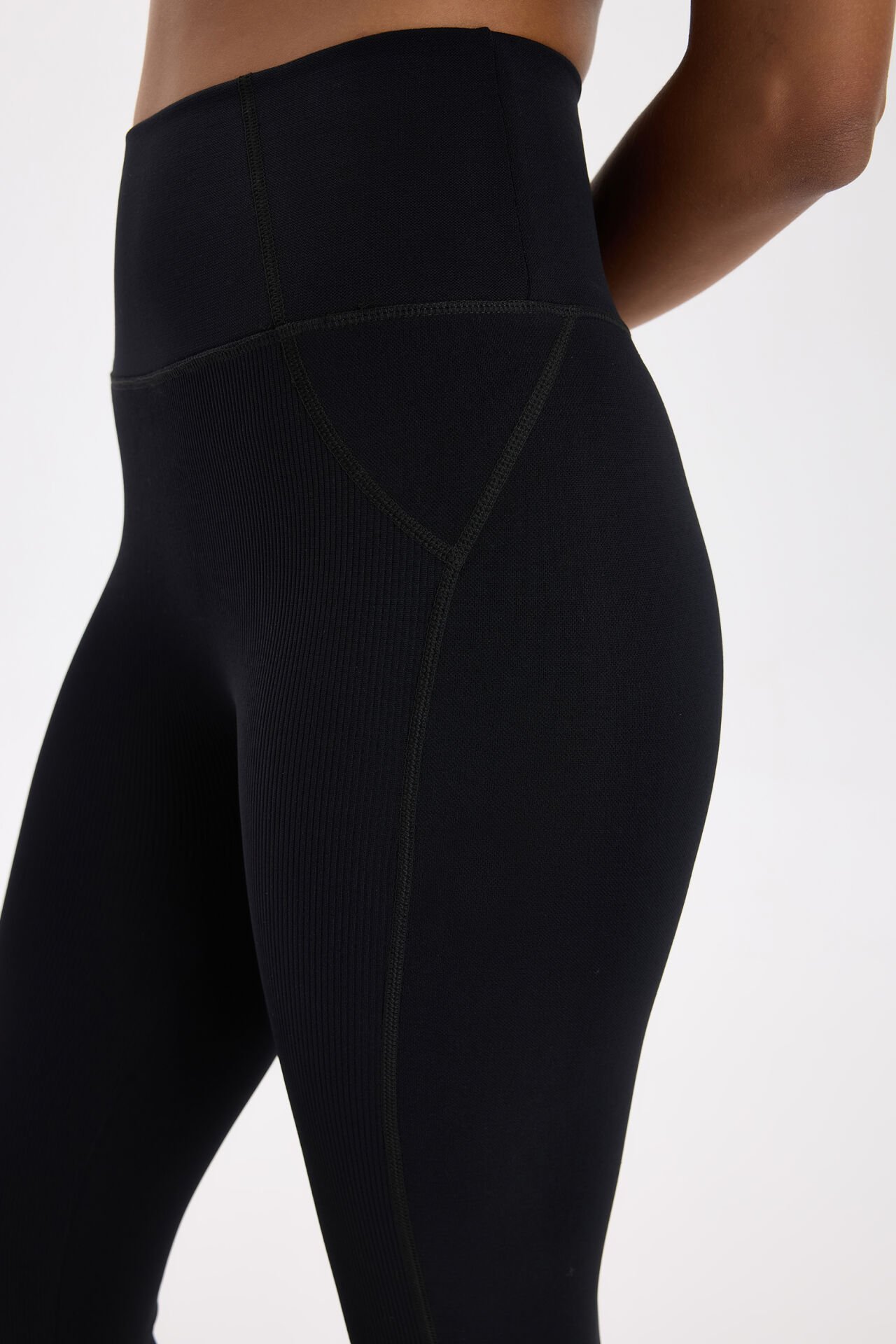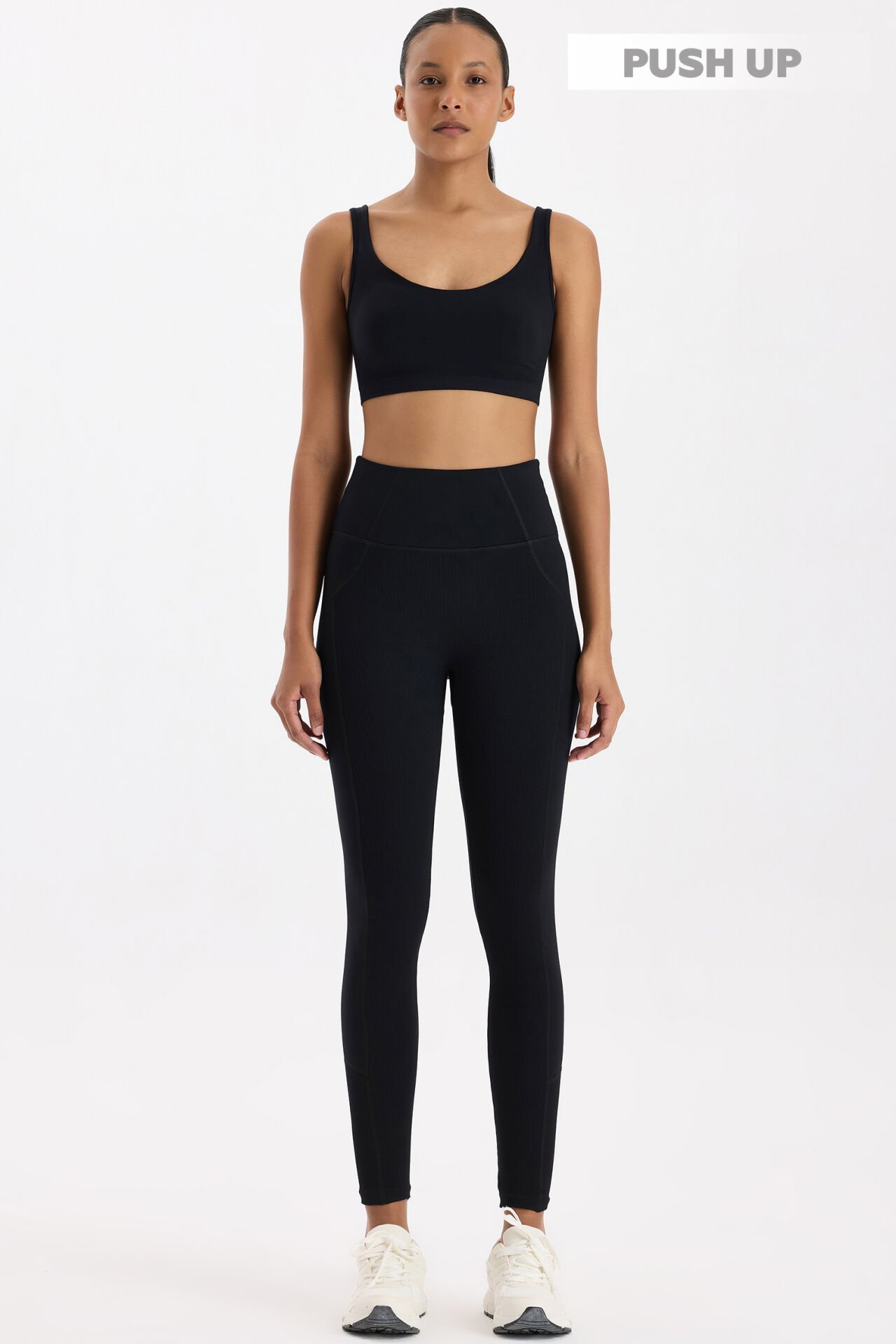 Toparlayıcı ve her yöne esneyebilen kumaş ile tasarlanan push up tayt, önde ve paçalarda fitilli, arka ve yanlarda düz kumaş dokusunun estetik dikişler ile birleştirilmesi ile dizayn edildi. Dikiş detayların ve farklı kumaş dokularının stratejik yerleşimi kusursuz bir toparlayıcılık ve estetik bir görünüm sunarken; yüksek bel kemeri arkada v şeklinde tasarlandı.
