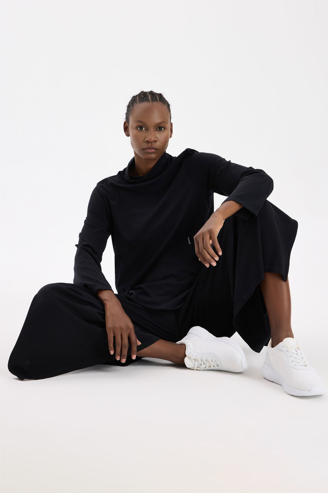 Zamansız siyah tonuyla her stile uyum sağlayan yüksek yakalı cepli sweatshirt, konforu ve şıklığı bir arada sunar. Hafif, dökümlü kumaş yapısı sayesinde gün boyu rahat hareket etmeni sağlar; nefes alabilir dokusu terlemeyi önlerken yumuşak hissiyle cilde nazikçe temas eder.
